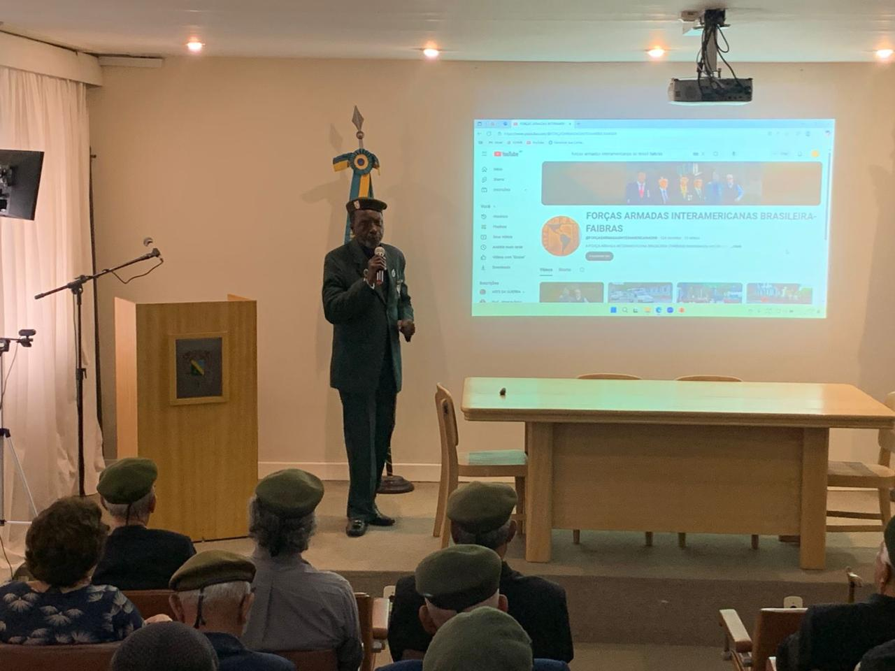 Imagem 5 – Sr. Jorge Alves da Conceição, presidente da Associação dos Veteranos da FAIBRÁS, palestrando sobre os 60 anos da FAIBRAS, em evento promovido pelo Instituto de Geografia e História Militar do Brasil (IGHBM), com apoio do Clube Militar (AGO 2025). |